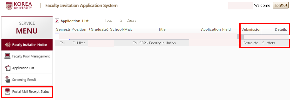 Applicants who have requested the submission of recommendation letters for the second-stage review of the Fall 2026 Faculty Invitation can check the receipt status as follows: